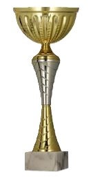 Kuppi metallia, väliosat muovia, jalusta vaalea kivi.