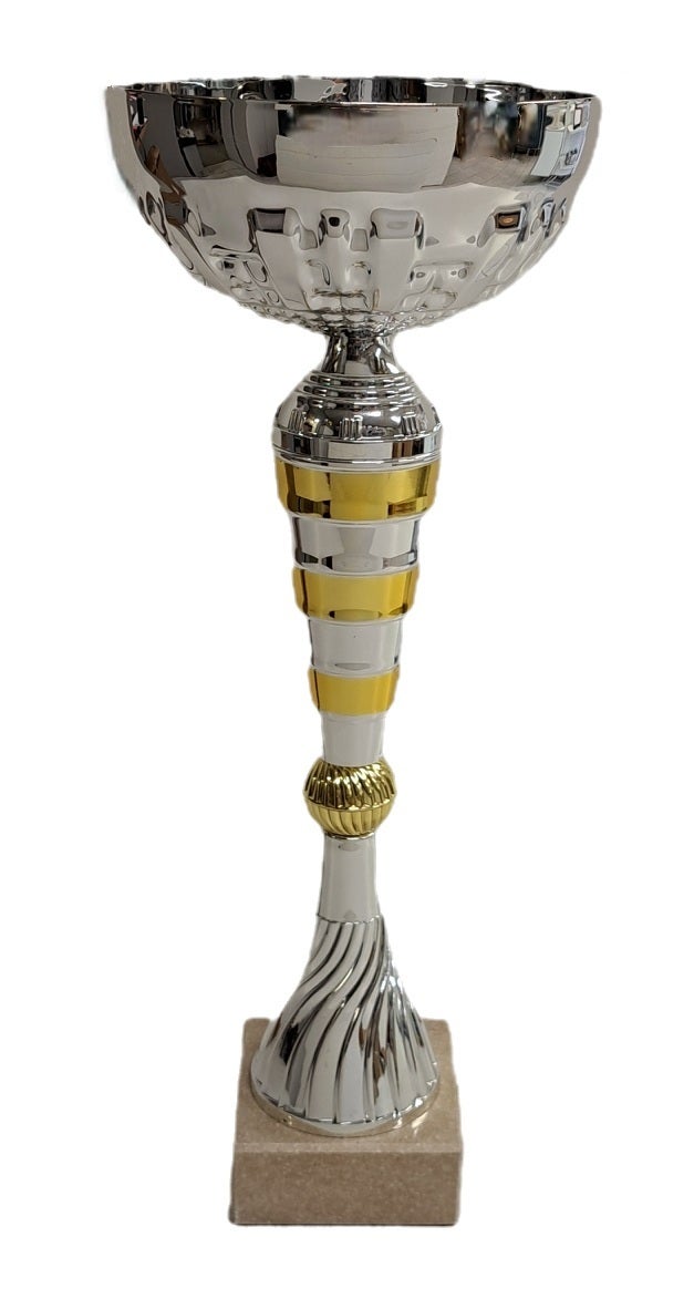 Hopean värinen metallinen kuppi, väliosat muovia väritys hopea/kulta, jalustana vaalean beige kivi.