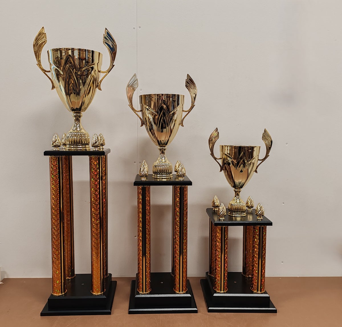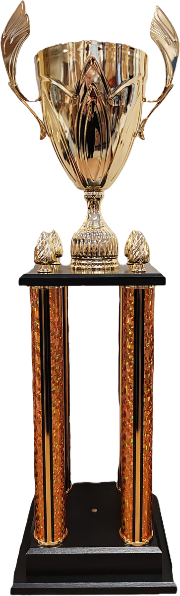 Metallinen kuppi, väritys kulta. Väliosat muovia, kullan värinen hologrammi. Musta puujalusta.